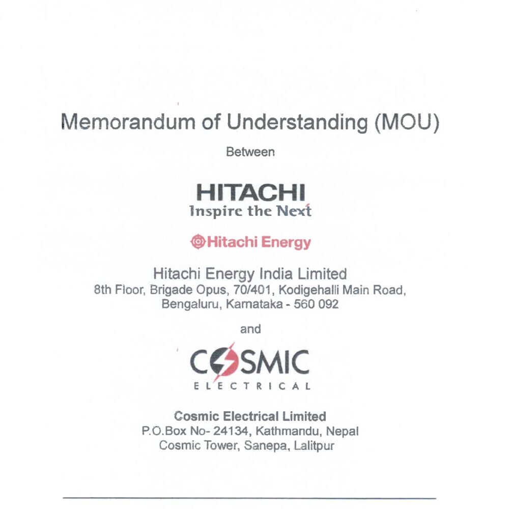 December 8, 2024 Cosmic Electrical Limited Partners with Hitachi Energy India Limited to Advance Nepal’s Power Sector Cosmic Electrical Limited has signed a Memorandum of Understanding (MOU) with Hitachi Energy India L...
