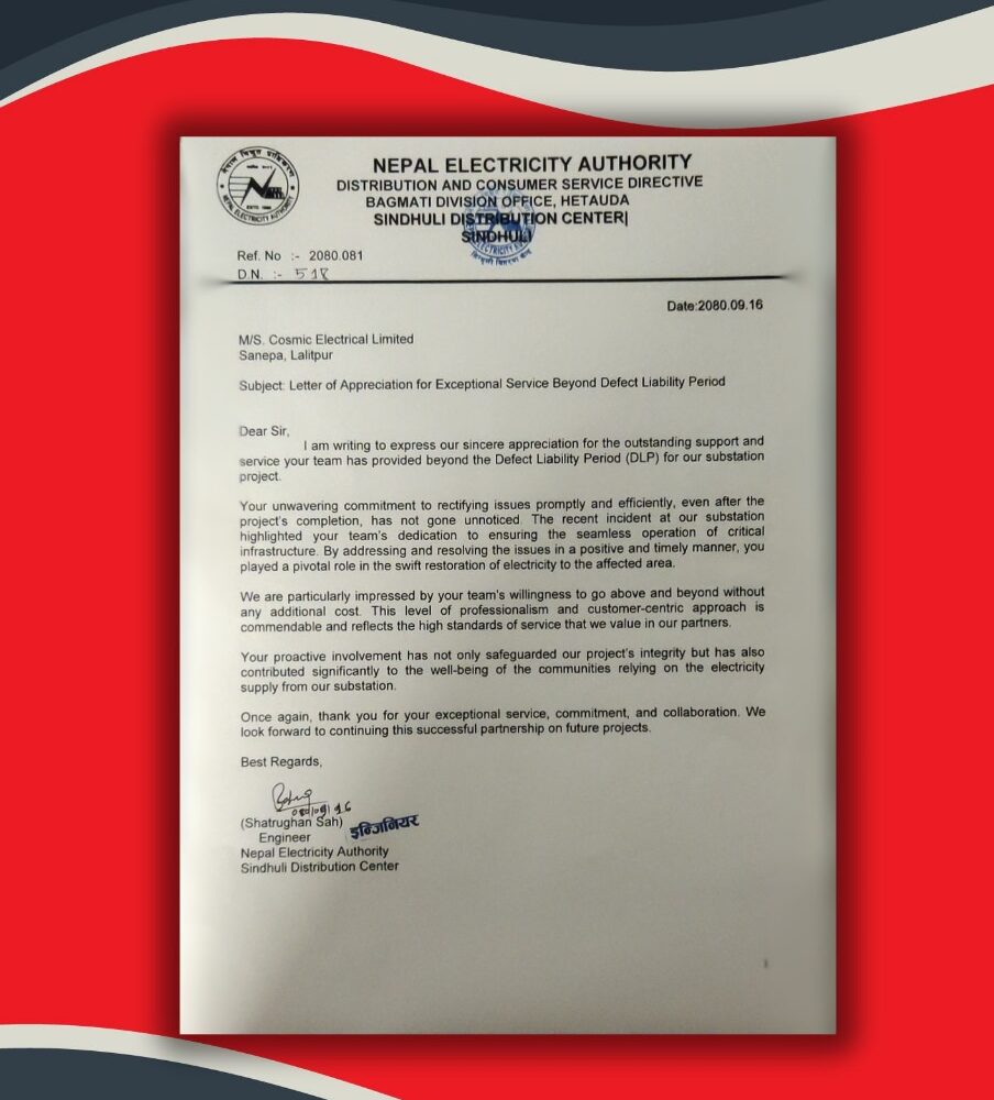 January 3, 2024 Cosmic Electrical Limited Receives Heartfelt Appreciation from Nepal Electricity Authority for Exemplary Client-Centricity Lalitpur, 1st January 2024 Cosmic Electrical Limited, a leader in Energy Infrastructure field, proud...